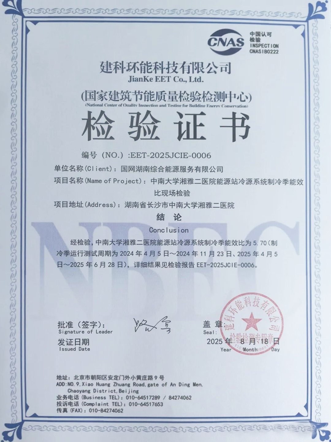 The Inspection Certificate issued by the National Building Energy Efficiency Quality Inspection and Testing Center (accredited by CNAS) shows that the project's comprehensive seasonal energy efficiency ratio (EER) during the cooling season reached 5.70, higher than the average level for medical industry air conditioning systems. At the core of this achievement lies the technical advantage of the MULTISTACK Jiefeng flooded magnetic levitation unit: patented magnetic bearing technology eliminates mechanical friction, achieving an energy saving rate of over 40% while significantly reducing operational noise, thereby not interfering with environmentally sensitive areas like the ICU and Neonatology Department. This third-party authoritative test report stands as solid recognition of MULTISTACK Jiefeng's magnetic levitation technology performance.