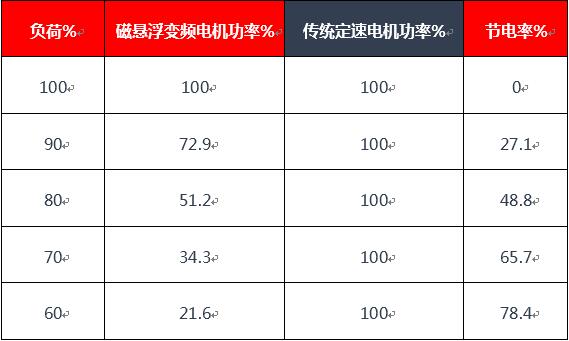 磁懸浮中央空調在部分負荷運行時,通過對磁懸浮壓縮電機的變頻調節30-800hz,機組的負荷調節范圍可以從5%-100%,由于壓縮機功耗與壓縮機的轉速的三次方成正比的關系,當機組制冷負荷下降,電機轉速下降,電機電功率將大幅下降,IPLV綜合部分負荷性能系數高達11.2;而傳統機組通過旁通吸氣排氣的方式或者調節吸氣導葉閥的方式進行負荷調節,電機功耗未發生明顯變化,COP值一般在6左右,而IPLV在7左右,所以磁懸浮機組的部分負荷時的能效遠遠高于傳統機組;