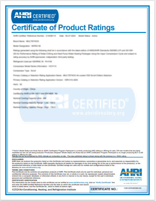 這款“新伙伴”的核心優勢,首先體現在權威認證與靈活適配的雙重保障上。MVRA全系列通過美國AHRI權威認證,單臺冷量覆蓋70KW~420KW,支持1-16臺模塊自由組合,既能適配中小型場所,更能輕松滿足醫院這類大型用冷項目的復雜需求,展現出極強的場景適應性。